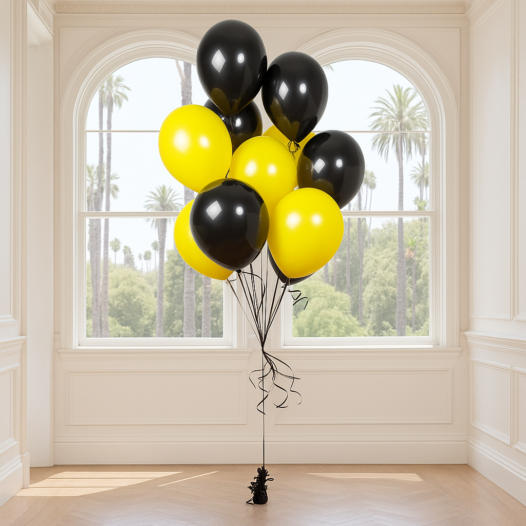 12-11 inch yellow latex balloons, 12-11 inch black latex balloons. Helium, strings and one weight is included.