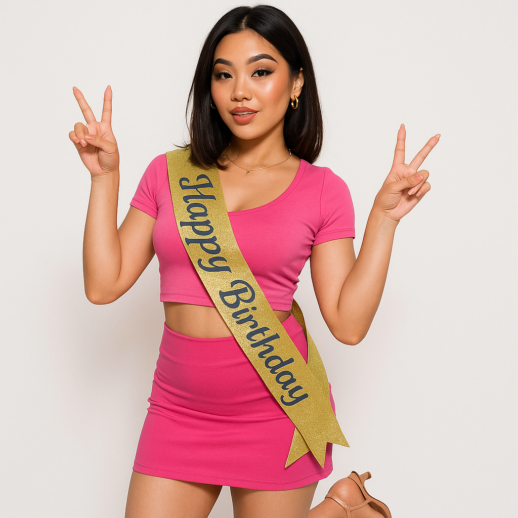 Make birthdays extra special with our ONE UP Happy Birthday Gold Sparkly Sash! This glamorous sash is designed to add a touch of elegance and fun to any birthday celebration, ensuring the birthday person feels truly celebrated.